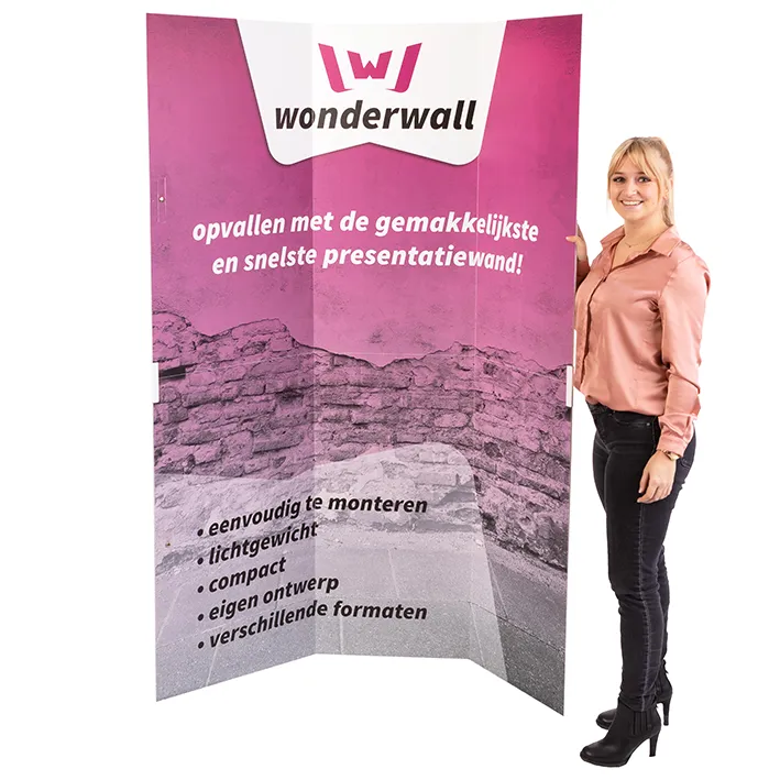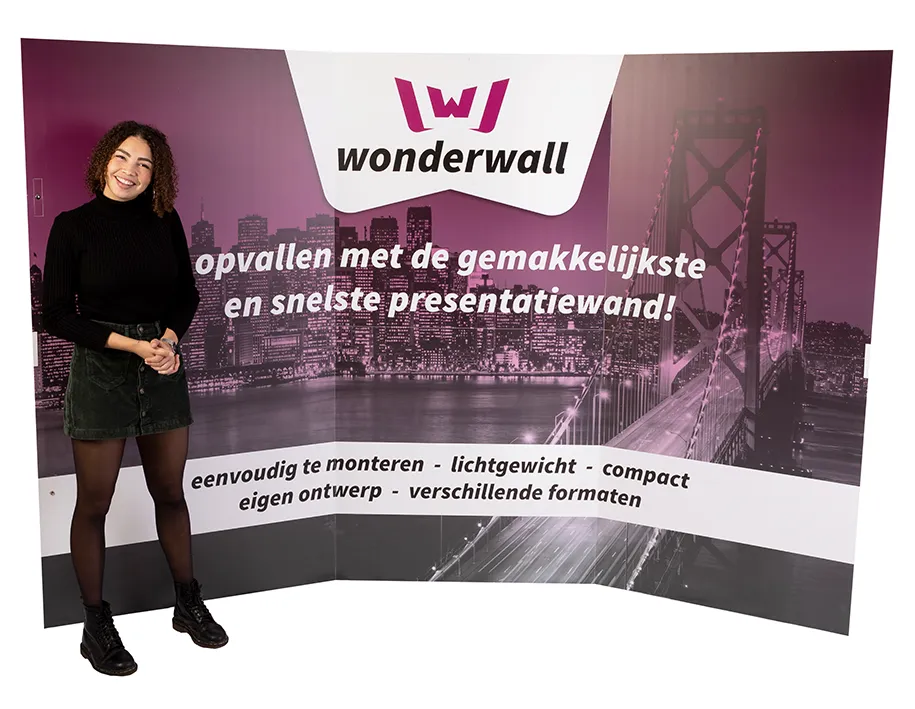 De Wonderwand is vervaardigd uit 5 mm kanaalplaat en slim gesneden zodat je hem moeiteloos kunt vervoeren. Binnen slechts 25 seconden creëer je een strakke, professionele presentatie. Monteren en demonteren gaat volledig gereedschapsvrij en dankzij het compacte, opklapbare ontwerp is de Wonderwall eenvoudig te transporteren. De wand wordt voorzien van jouw gewenste ontwerp door middel van oin hoogwaardige print en is snel leverbaar.